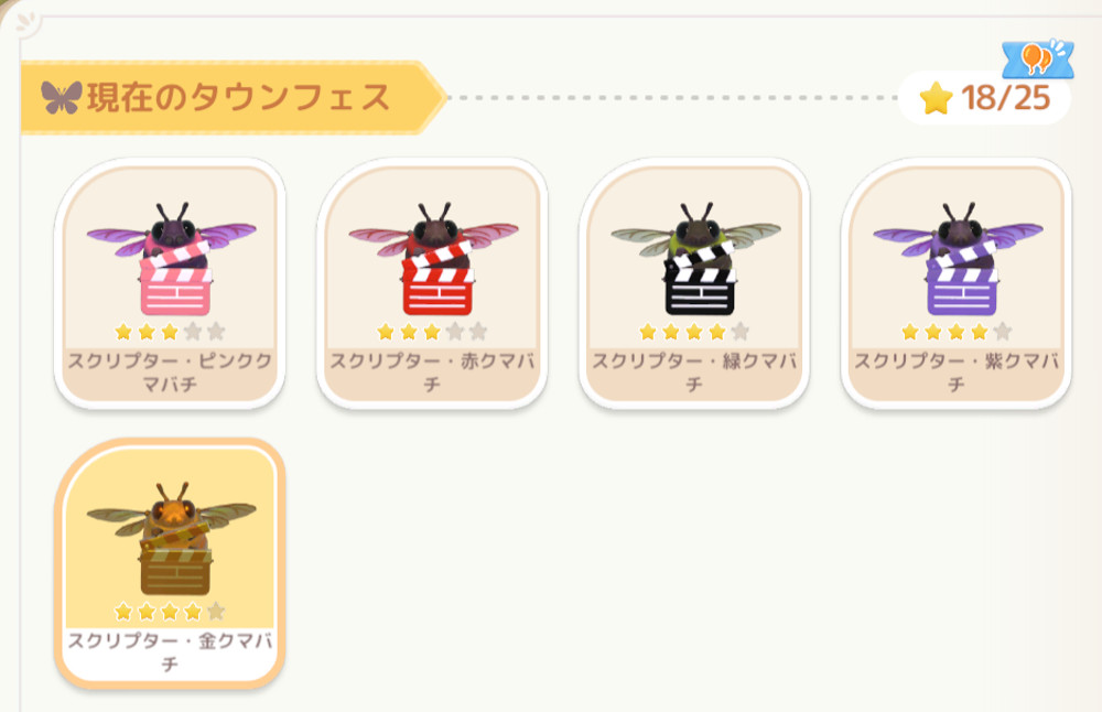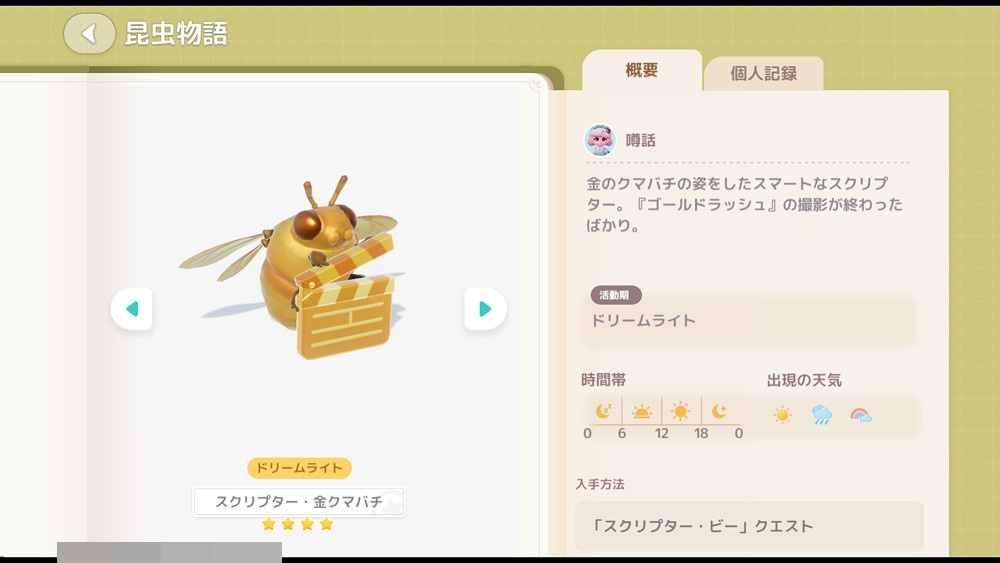 限定の虫は『スクリプタービー(スクリプタークマバチ)』となっており、全5種類が入手できます。