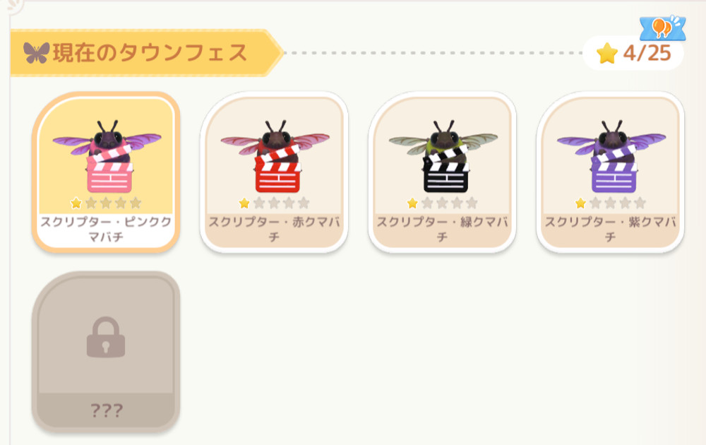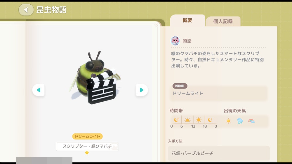 1週目の時点では全4種類のスクリプタービー(スクリプタークマバチ)が捕まえられます。