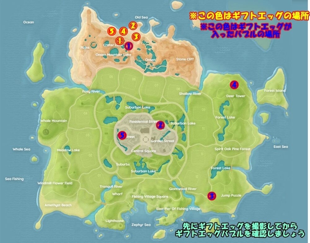 | 日数 | ギフトエッグの場所 | ギフトエッグバブルの場所 |