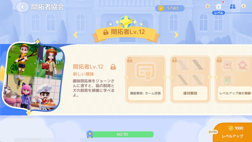 | 猫の飼育 | 開拓者レベル12で開放 |