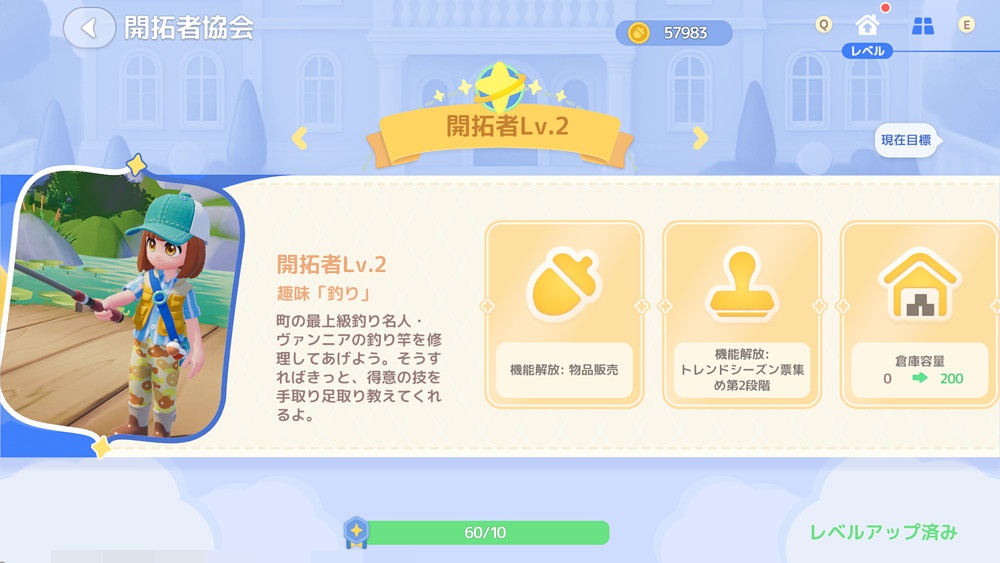 そのうちの1つが趣味となっており、開拓者レベル2で初の趣味『釣り』が開放されます。