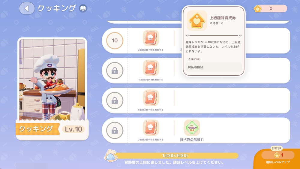 趣味レベル11以降は上級趣味育成券が必要