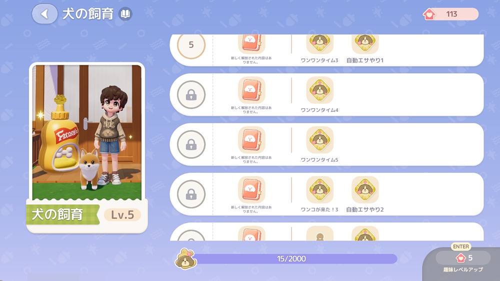 趣味レベルをあげると、捕獲できる種類が増えたり、料理の種類などが増えます。