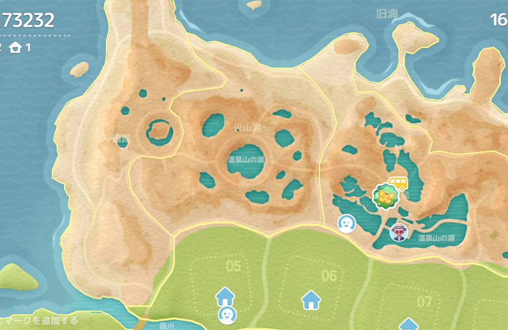 見つからない場合は、マップの上にある茶色いエリアの温泉山の湖を見に行ってみてください。