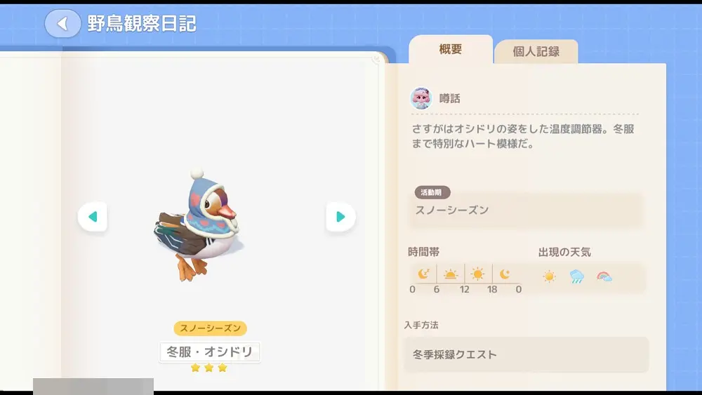冬服のコトリ『冬服オシドリ』は、ベイリーから受注できる『冬季採録クエスト』からしか出現しません。