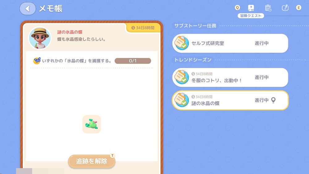 ハートピアスローライフのスノーシーズンイベント2週目に、『氷晶の蝶を捕獲』するクエストが解放されました。