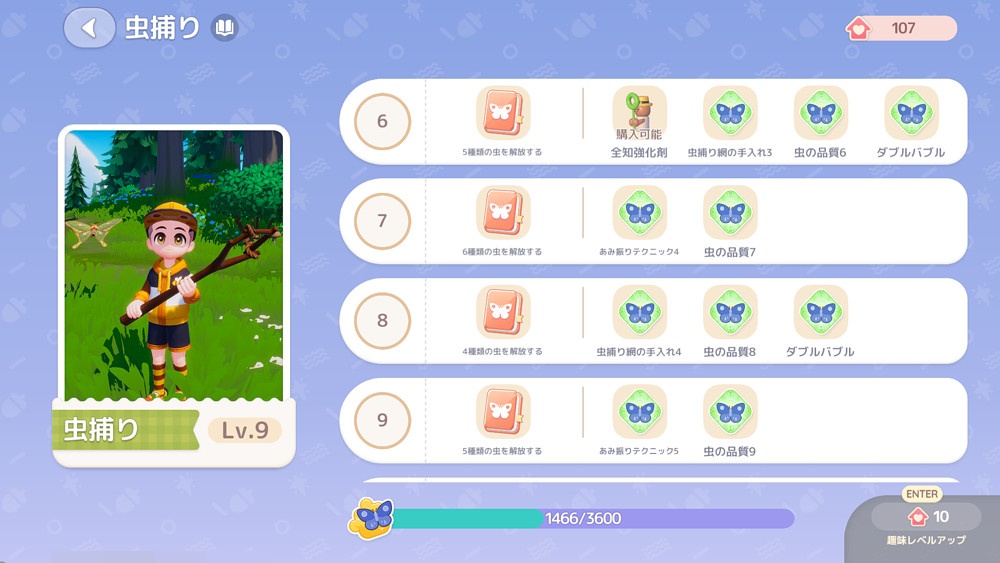 虫捕りレベルを上げるには、虫を捕獲して趣味レベルを上げなくてはいけません。