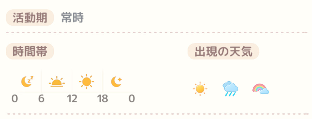 | 時間帯・天気 | 全時間、全天候で出現 |