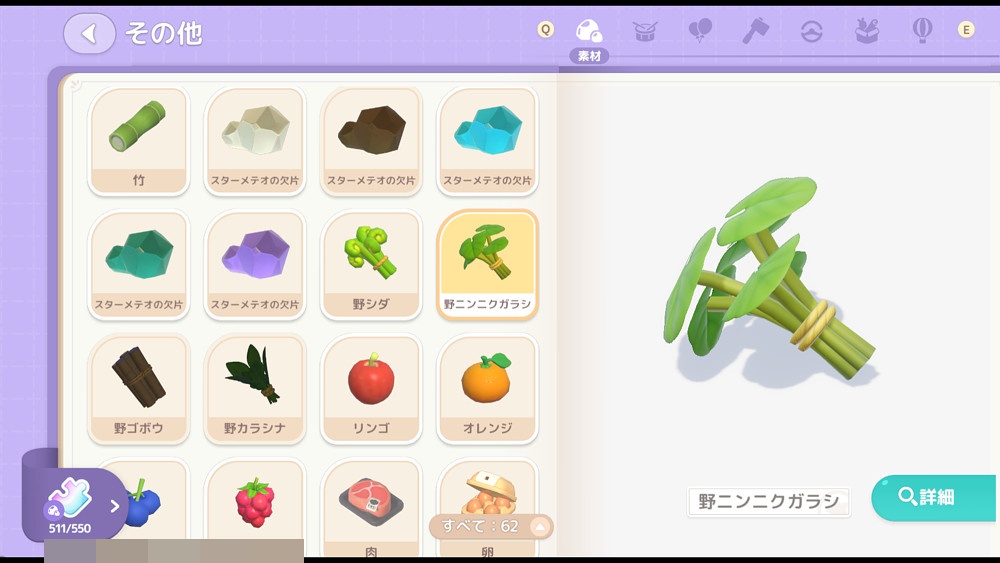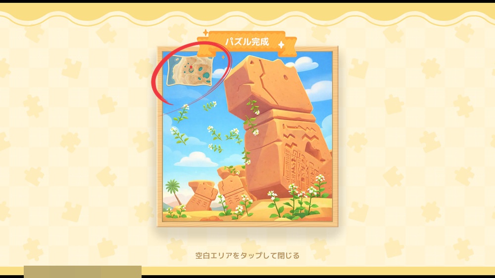 パズル完成後、パズルに記載されている場所(カピバラの餌箱周り)にいくと、3個×2箇所=6個分がプラスで採取できるように!