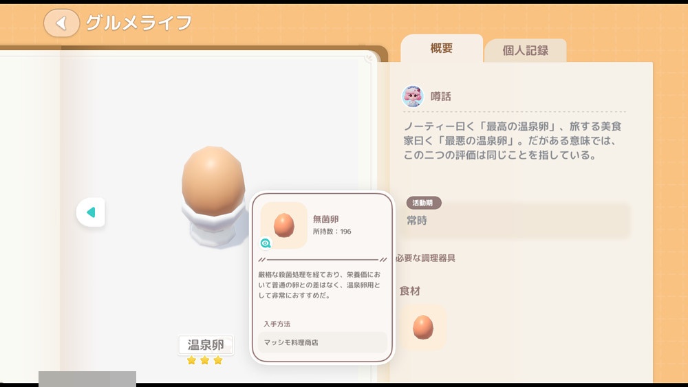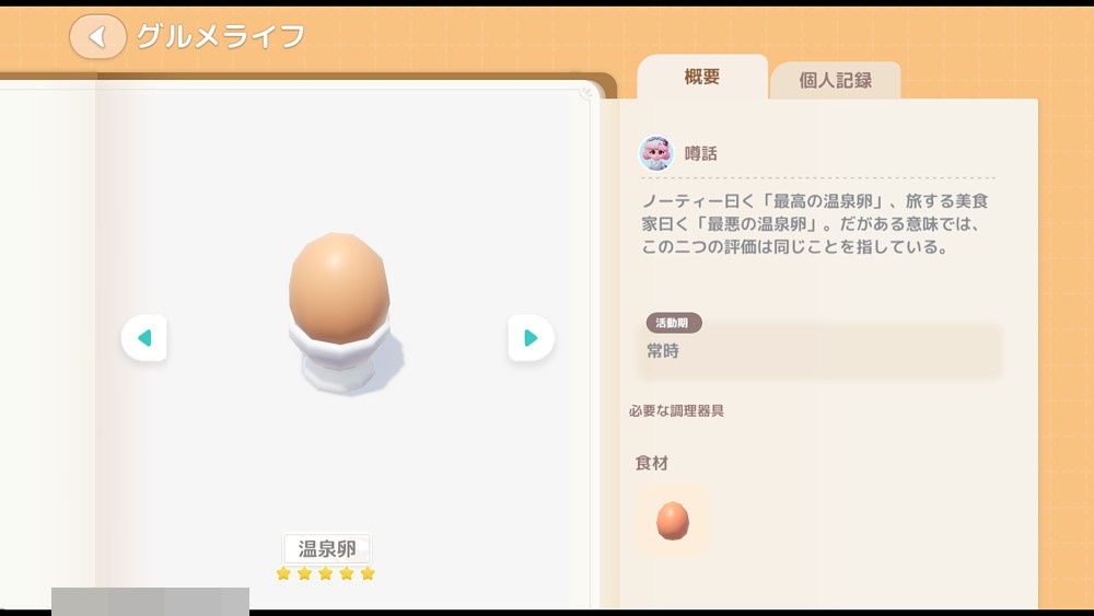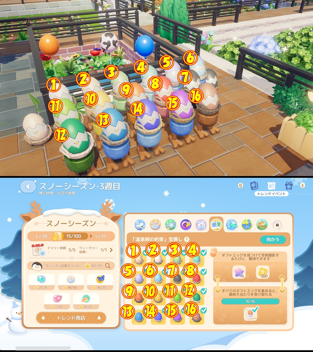 ギフトエッグを撮影することで宝探しの図鑑が埋まり、全16個を集めると温泉卵のレシピがもらえます。