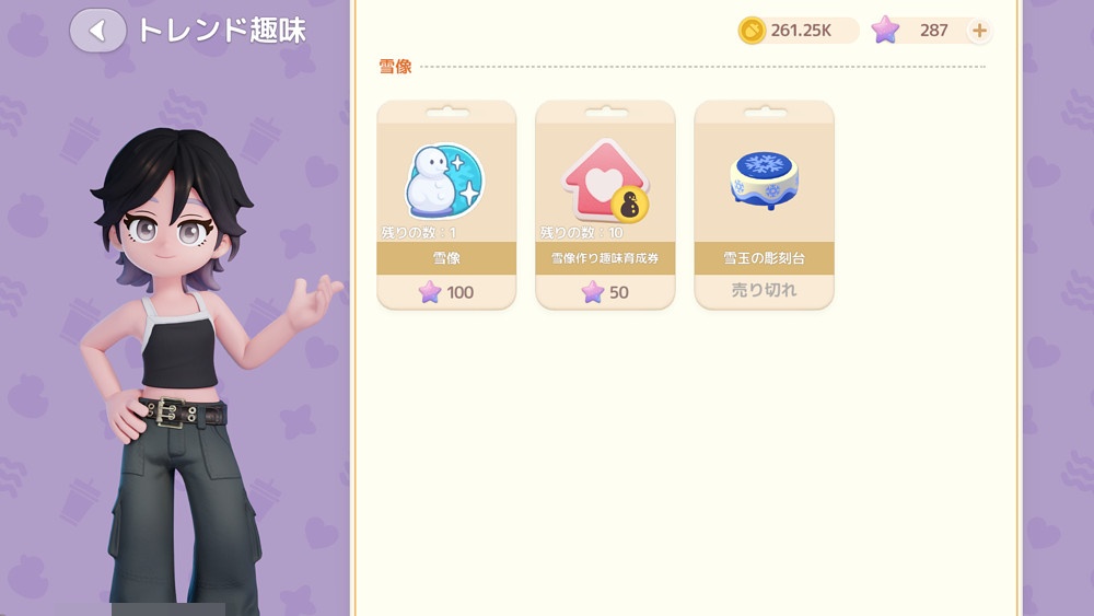 雪だるまアイコンの『雪像』を購入することで、雪像の趣味が解禁されます。