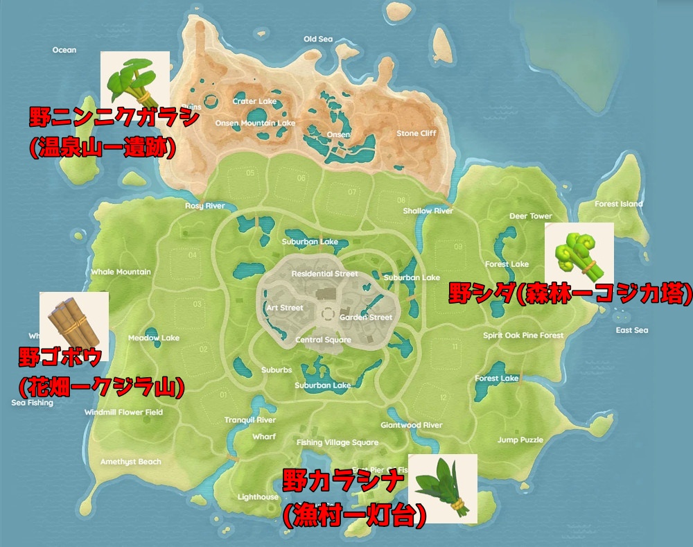 ハートピアスローライフ『山菜』の場所【簡易早見表】