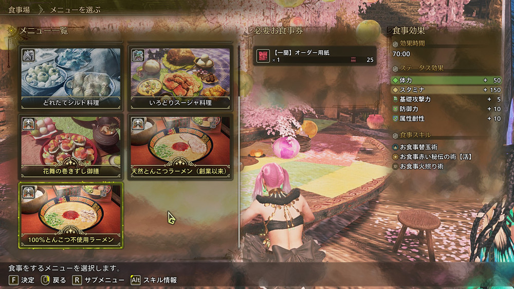 一蘭のサイドミッションをクリアすると、一蘭のメニューが常設され、オーダーチケットさえあればいつでも食べられるようになりました。